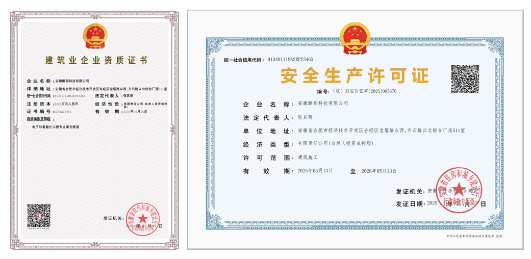 电子与智能化工程专业承包二级资质的取得,是对酷部科技在技术研发、项目管理、施工质量等多维度专业能力的权威认可,赋予我们参与更广泛、更高层次项目建设的资格,能为客户提供更优质全面的专业服务。而安全生产许可证的获取,则是对公司安全生产条件、管理制度、人员配备等方面严格审核后的高度肯定。长期以来,酷部科技始终将安全生产作为发展基石,构建完善管理体系,强化员工培训,严格把控项目各环节安全标准。